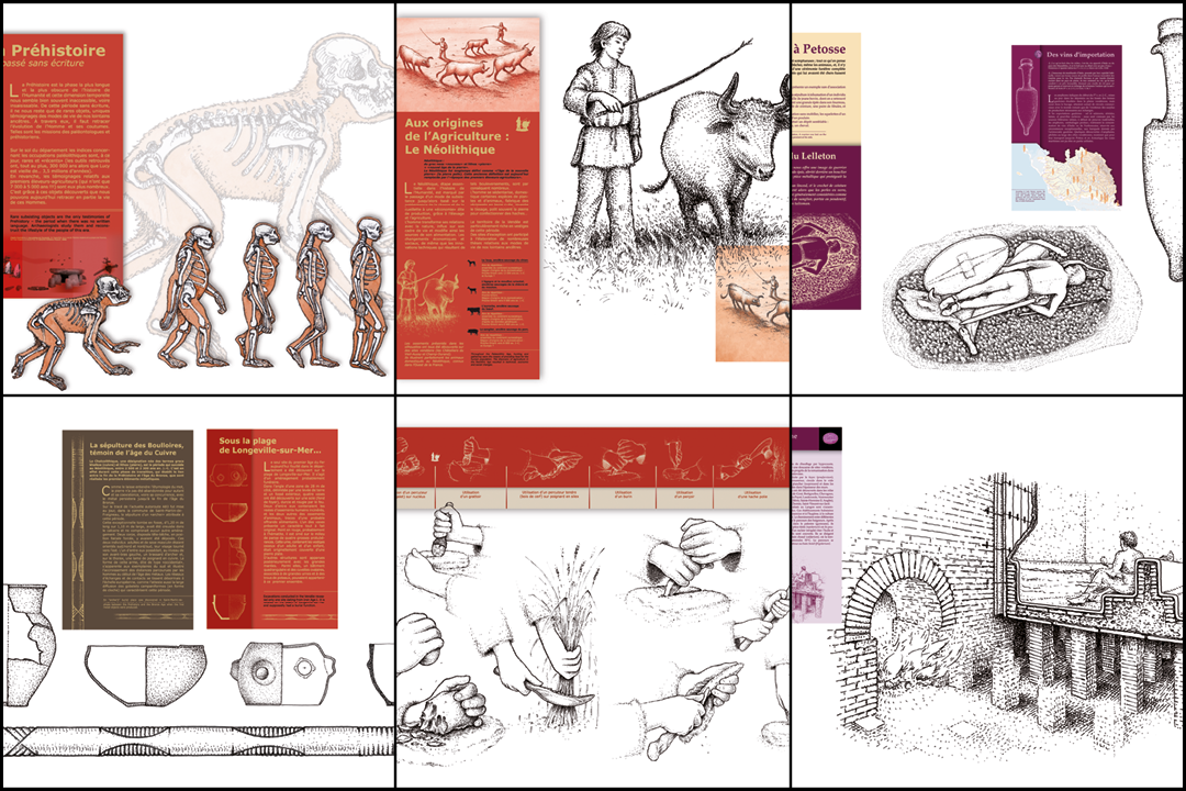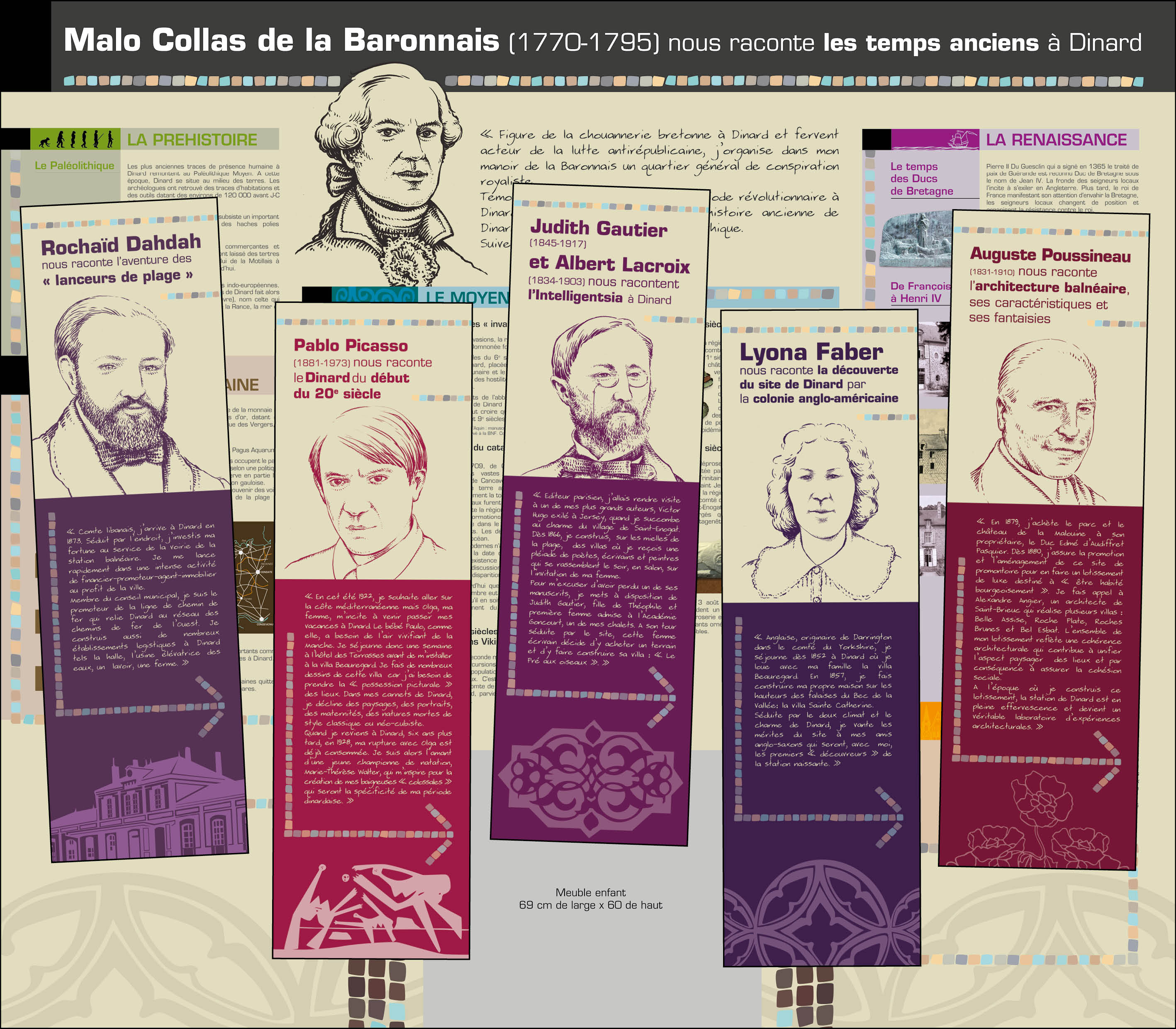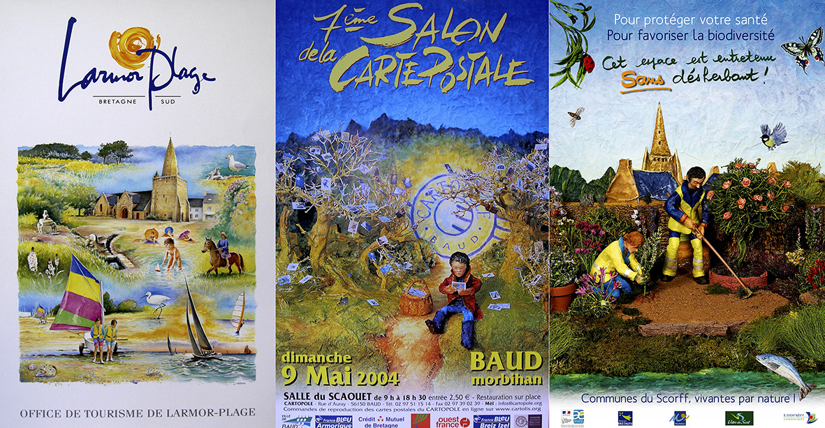 Les collaborations avec les collectivités depuis plusieurs années sont nombreuses pour la création d’expositions, de panneaux pour des circuits touristiques, « nature », la mise en valeur du patrimoine, la muséographie, dans les départements du Morbihan, du Finistère ou le Grand Ouest(Conseil Départemental du Morbihan, Lorient Agglomération, Ploemeur, Quistinic, Gestel, Crach, Quimperlé ou encore l’ancien Syndicat du Bassin du Scorff ou le Grand site dunaire Gâvres Quiberon, réserve naturelle de Moëze d’Oléron).
